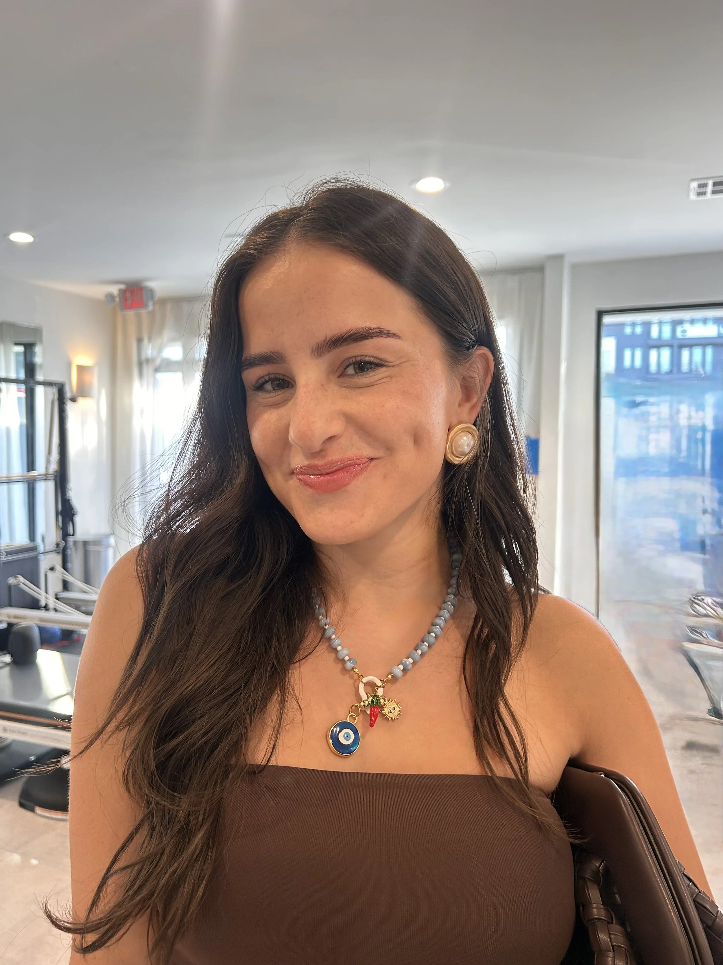 17 inch blue opal beads with white spacer beads and 18K gold filled horseshoe carabiner